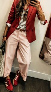 Sometimes you need think about your footwear and work up. Consider what are your favourite and most comfortable shoes? What style of jean will work best with them? Perhaps it’s a new pair of trainers which are needed to create outfit versatility? Coloured trainers have replaced white ones in the fashion stakes, and they are surprisingly versatile, adding a pop of interest and colour to your outfit. However, my only word of caution is for those of you that are particularly vertically challenged – you are often best to keep the colour of your footwear toned with your hosiery and hemline.