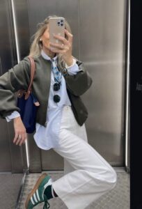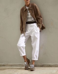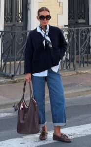 But I think the way to stand out in what is basically a simple, classic outfit is how you accessorise. Look at these examples from Pinterest at how accessories create those extra details that define your style – the design of sunglasses, choice of jewellery, placement of a scarf (this doesn’t have to be round your neck but could be tied to your bag, around your waist instead of a belt or in your hair), the style of bag and how the fabric might mould to your body. Again, the current trend of suede is a great option and adds texture and interest (but always spray with fabric protector before wearing). These are all touches that will elevate your look.